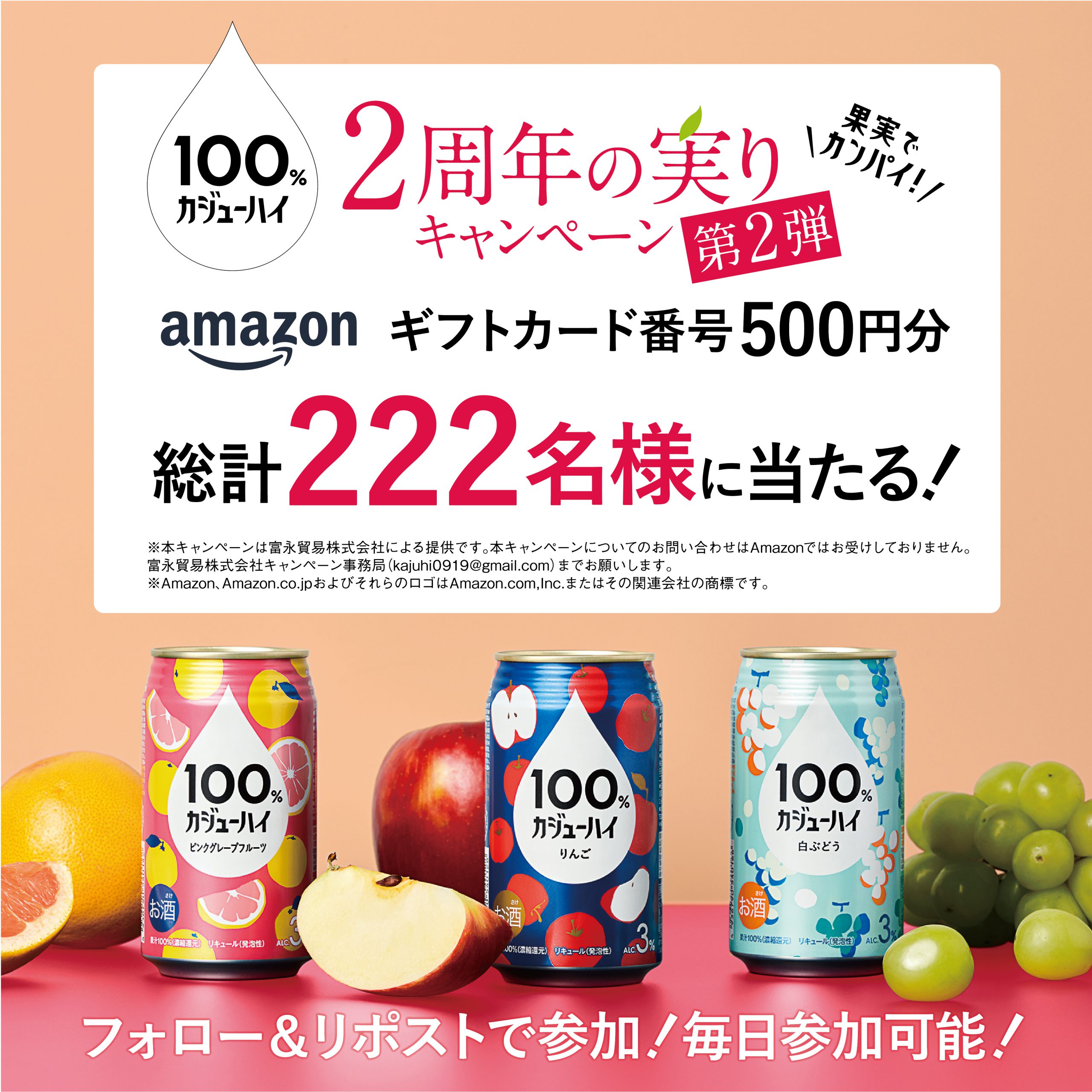 富永貿易株式会社(以下、「当社」といいます。)が「100%カジューハイ」公式Xアカウントにて実施する「100%カジューハイ2周年の実りキャンペーン第2弾」(以下、「本キャンペーン」といいます。)へのご応募を希望される方は、本応募規約(以下、「本規約」といいます。)をよくお読みの上、同意される場合のみご応募ください。なお、本キャンペーンにご応募された方は、本規約に同意したものとみなします。